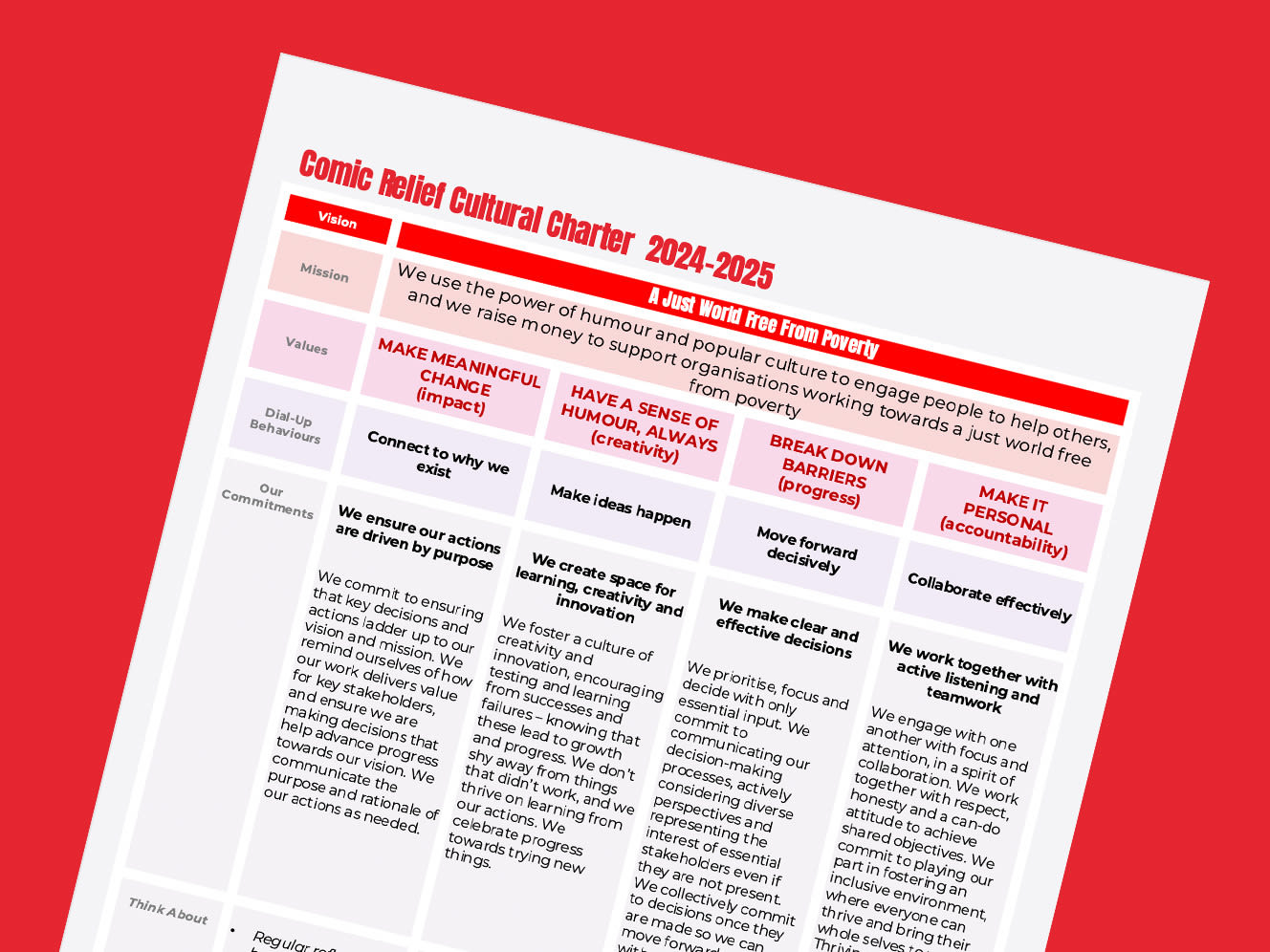 At Comic Relief, our Cultural Charter reflects our commitment to inclusivity, collaboration, and creative excellence. Guiding our mission to drive social change, it shapes how we work together and helps us empower communities. Join us in creating an inspiring environment where everyone thrives and helps to deliver real-world impact through innovation and compassion.
