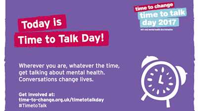 You can join in the conversation online using the hashtag #timetotalk on Twitter or Facebook. For more information and to get involved in Time to Talk Day visit time-to-change.org.uk(opens in new window).